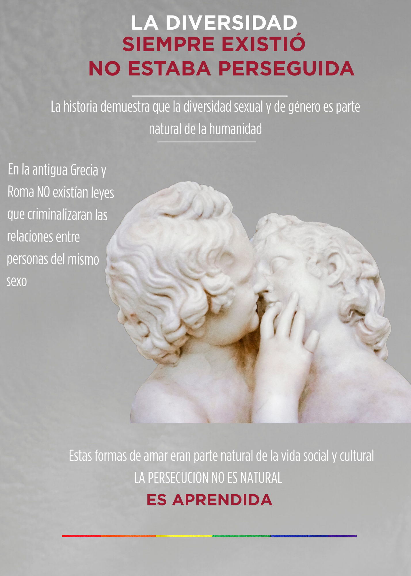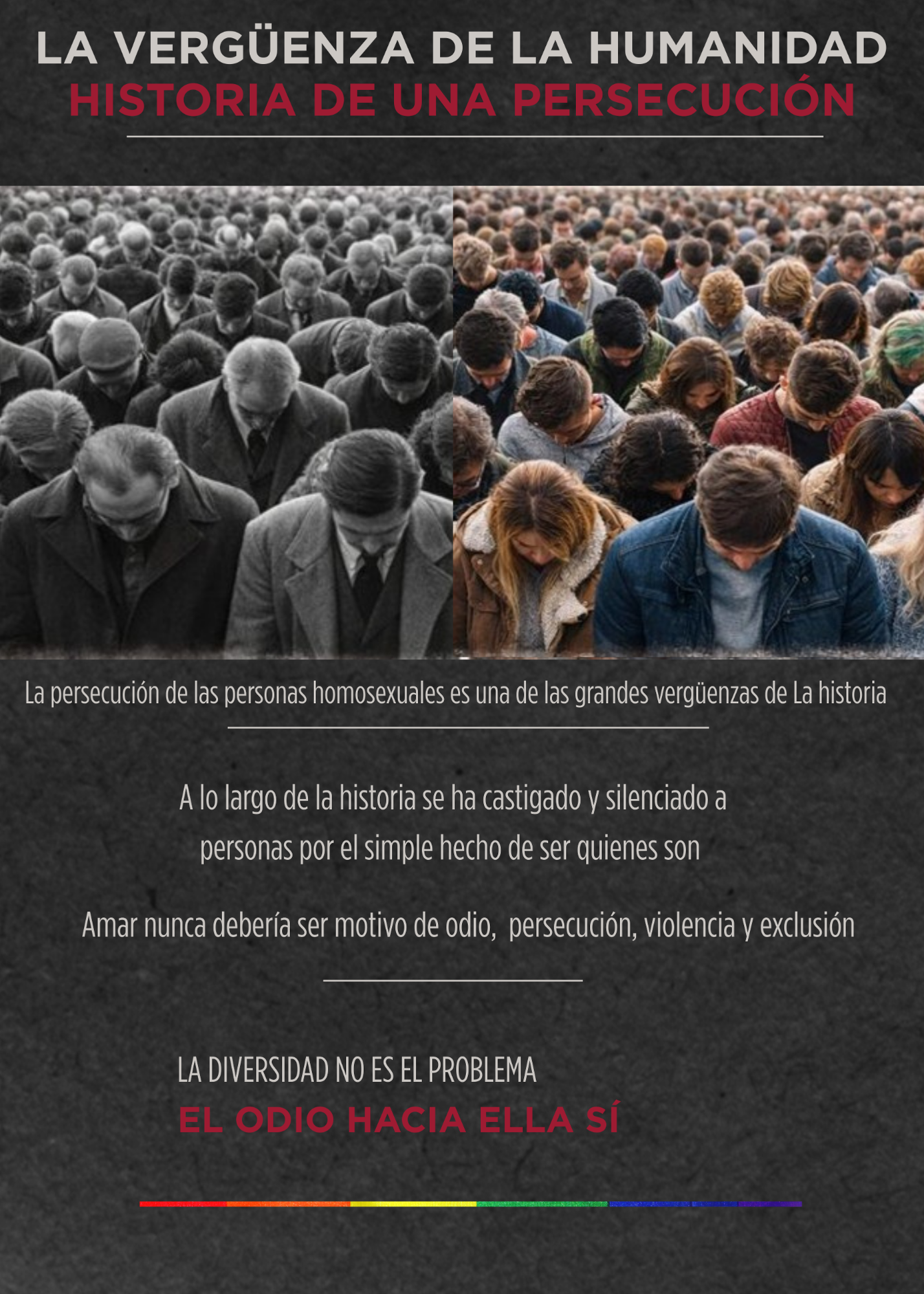 Esta exposición invita a mirar de frente una de las grandes vergüenzas de nuestra historia: la persecución de las personas LGTBIQ+. A lo largo de la historia, la humanidad ha señalado, castigado y silenciado a personas por el simple hecho de ser quienes son. Amar, sentir o existir fuera de la norma impuesta ha sido motivo de persecución, violencia y exclusión.